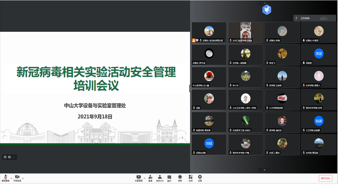 为落实国家、广东省关于新冠病毒相关实验活动管理要求,进一步规范我校新冠病毒相关实验活动管理,确保实验室生物安全,2021年9月18日,设备与实验室管理处组织涉及新冠病毒相关实验活动的二级单位分管领导、安全员以及相关实验室师生召开新冠病毒相关实验活动安全管理线上培训会议。