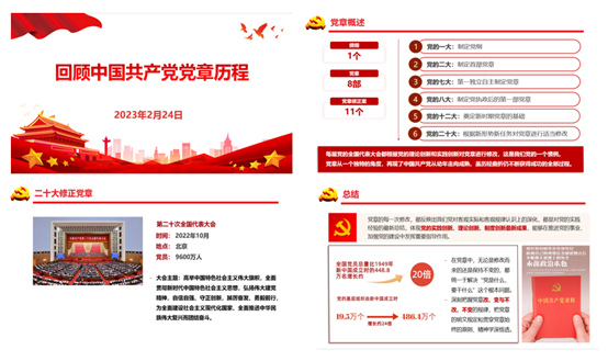 邓嘉怡同志作《回顾中国共产党章程历程》专题学习报告。党章是党的根本大法,是全党必须共同遵守的根本行为规范,集中体现了党的基本理论、政治主张、集体意志和原则要求。报告梳理了从中共一大到党的二十大以来历次党章的制定与修改情况,结合丰富的史料,从历史的视角回顾了党章从无到有到、从制定到修订、从概括到成熟的发展历程,并重点导读了党的二十大党章修正的九大要点。从学习报告中,支部同志们感受到党章的每一次修改,都是对党的实践经验的最新总结,体现党的实践创新、理论创新和制度创新的最新成果,在推进党的事业、加强党的建设中发挥了重要指导作用,作为党员,应深刻把握党章改与不改、变与不变的规律,正确行使自己的权利,认真履行自己的义务,规范自己的言行,自觉维护党的利益和推动党的事业健康发展