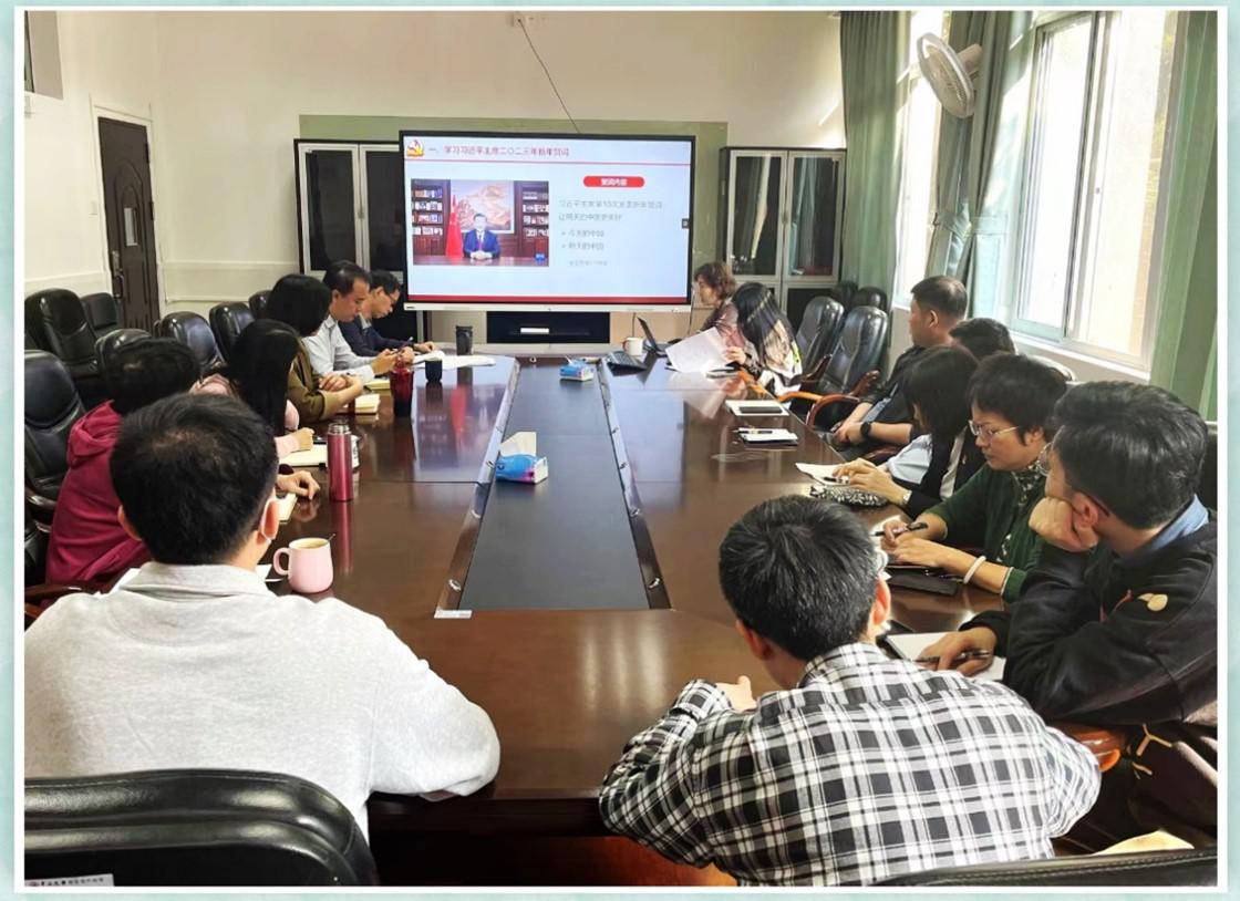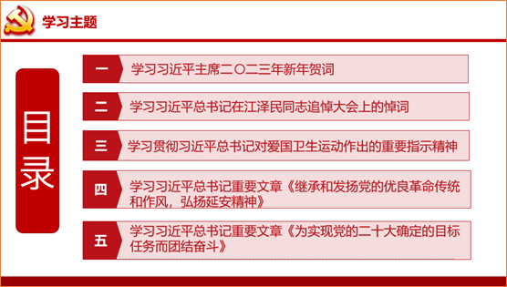 按照《机关党支部2023年1月、2月组织生活要点》的要求,赵国芳同志向参会人员重点导读了习近平主席二〇二三年新年贺词、在江泽民同志追悼大会上的悼词、对爱国卫生运动作出的重要指示精神、重要文章《继承和发扬党的优良革命传统和作风,弘扬延安精神》《为实现党的二十大确定的目标任务而团结奋斗》等5个学习要点,并简要介绍了其它学习要点。